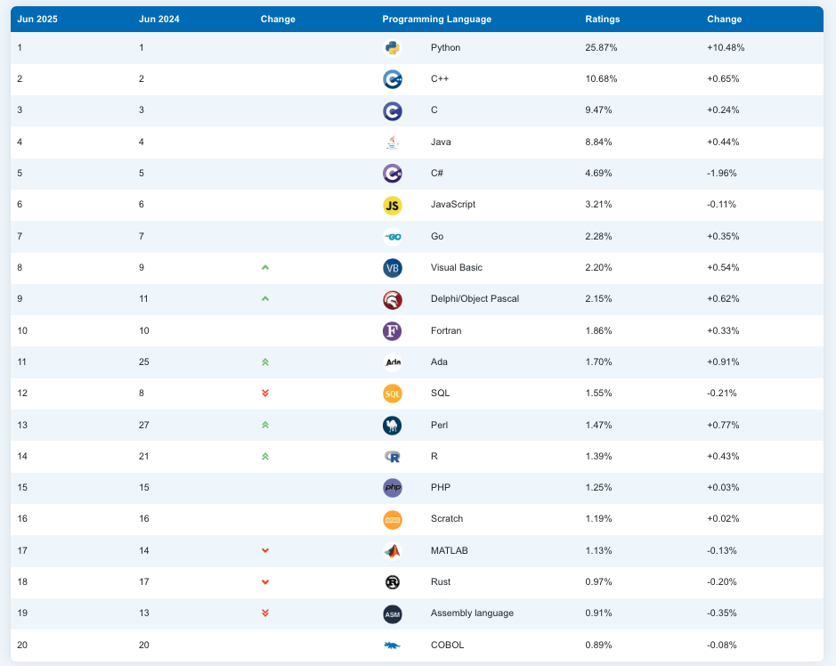 Về vấn đề này, Python vẫn duy trì vị trí dẫn đầu trong chỉ số, với tỷ lệ 25,87%, tăng 10,48% so với cùng kỳ năm ngoái.