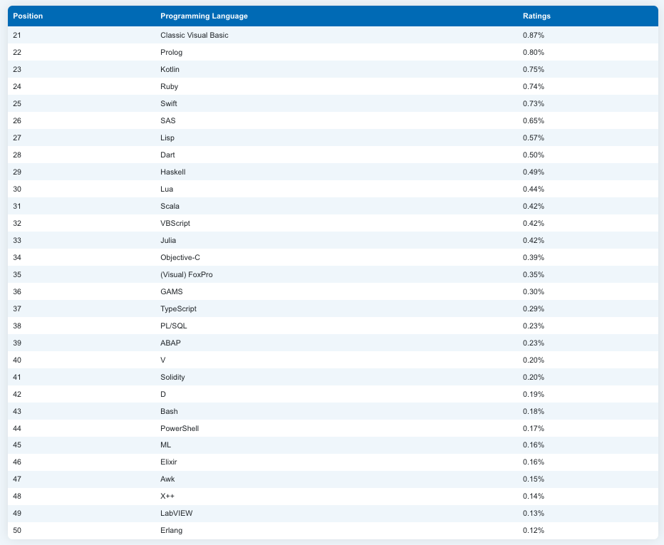 Nhìn vào các ngôn ngữ cổ điển, Fortran giữ vị trí thứ 10 ổn định qua các năm, trong khi Cobol cũng giữ vị trí thứ 20. Điều này, cùng với Assembly, cho thấy một ngôn ngữ có thể tồn tại được bao lâu – tất cả đều được tạo ra trong khoảng thời gian từ 1949 đến 1959.