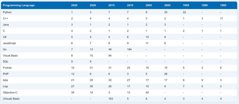 Các thay đổi đáng chú ý khác bao gồm Rust, đã trượt một bậc so với năm ngoái xuống vị trí thứ 18. Ada và R đều lọt vào top 20, lần lượt là 11 và 14, từ 25 và 21. Perl cũng tăng hạng, từ 27 lên 13. Sự sụt giảm lớn nhất là của Assembly, từ 13 xuống 19.