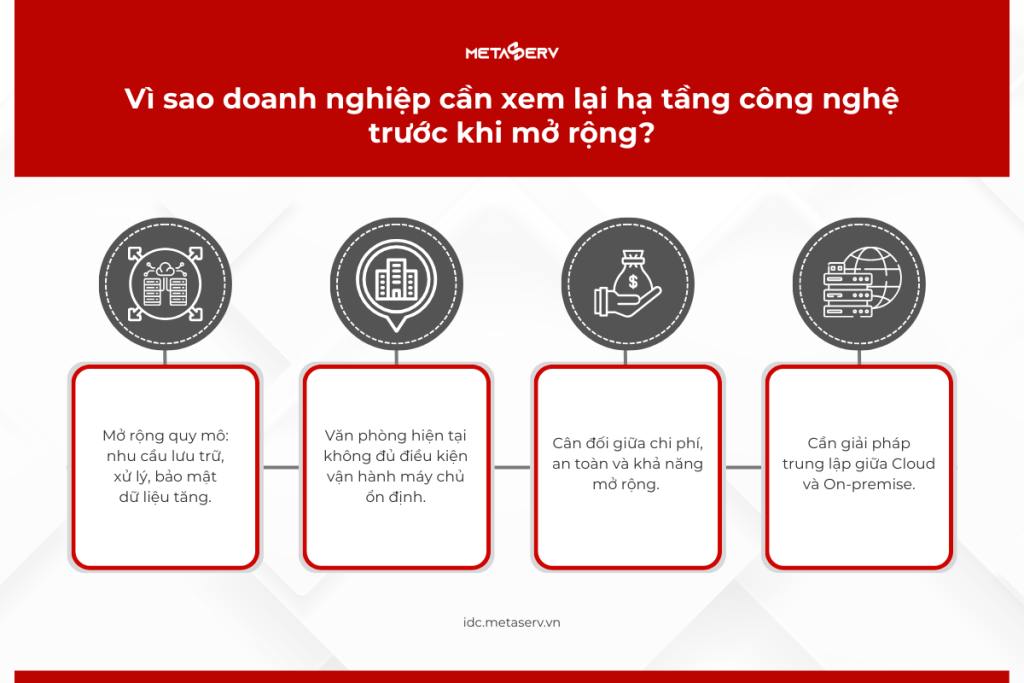 - Khó mở rộng: khi cần thêm máy chủ hoặc dung lượng, hạ tầng văn phòng dễ trở thành “nút thắt cổ chai”.